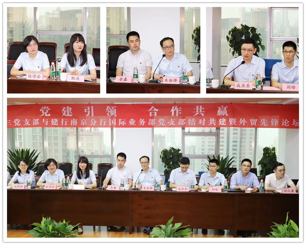 隨后,外貿公司第三黨支部書記王卓和建行南京分行國際業務部黨支部書記朱振鋒分別就各自支部的黨員構成和黨建工作開展情況作了交流分享,并相約在今后的共建活動中開展形式多樣、豐富多彩的交流活動,增強彼此了解,互融互通。